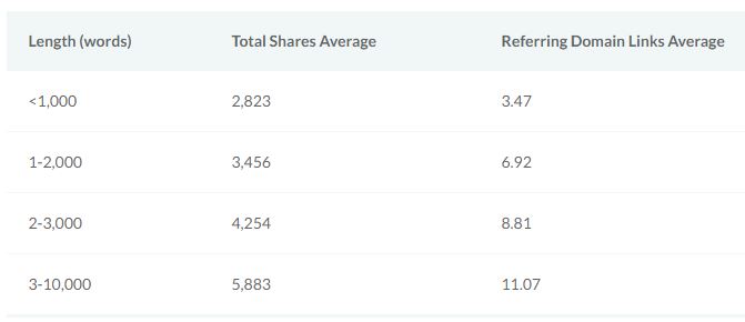 In 2015, Moz teamed up with Buzzsumo to analyse the shares and links of over one million articles. Amongst their findings, they looked at the impact of content length on total shares and domain links: