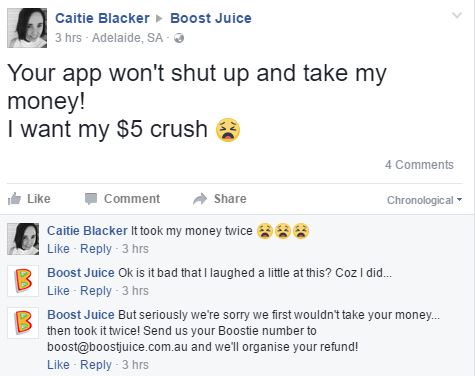 Boost Juice is a great example of a brand that uses humour in its responses to customers. The brand generally communicates in a very fun, laid back way, which allows for humorous but professional responses to negative comments.