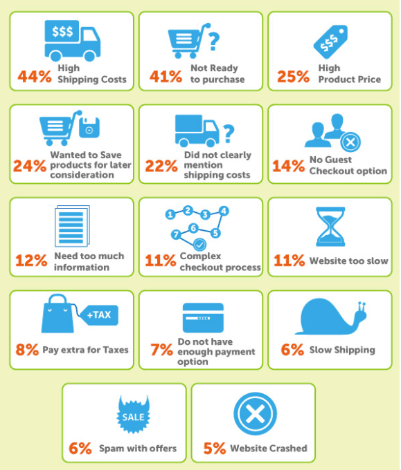 There are numerous reasons for cart abandonment, including high shipping costs, people comparing prices, high product price, complex checkout process, or slow shipping, to name a few.