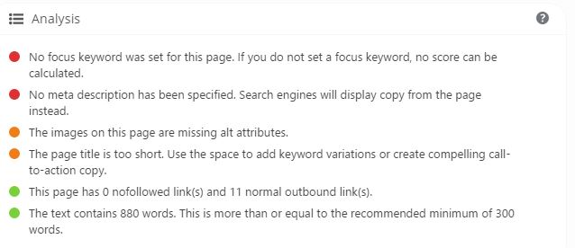 The plugin helps you to make your page more SEO friendly by presenting users with green circles. The colours work the same way as traffic lights - green is good, orange is average, and red is bad. After each coloured circle there is a description of the task, and if it is not green, what you can do to improve it.