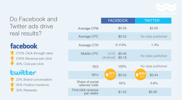 Wordstream found that Facebook is far cheaper than Twitter for cost per 1000 likes - Facebook costs $0.59, while Twitter costs $3.50. Seeing this vast difference in cost would make you assume Facebook is the most cost-effective option.