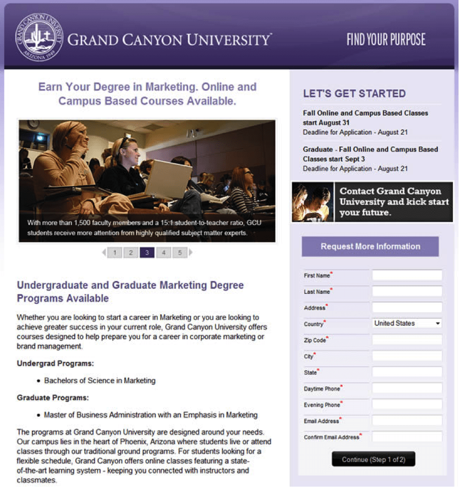 This value proposition does not clearly explain why people should choose Grand Canyon University over any other university. Where is the benefit to the customer? The landing page also places too much emphasis on the form to fill out, rather than redirecting customers to a new page to fill out the form.