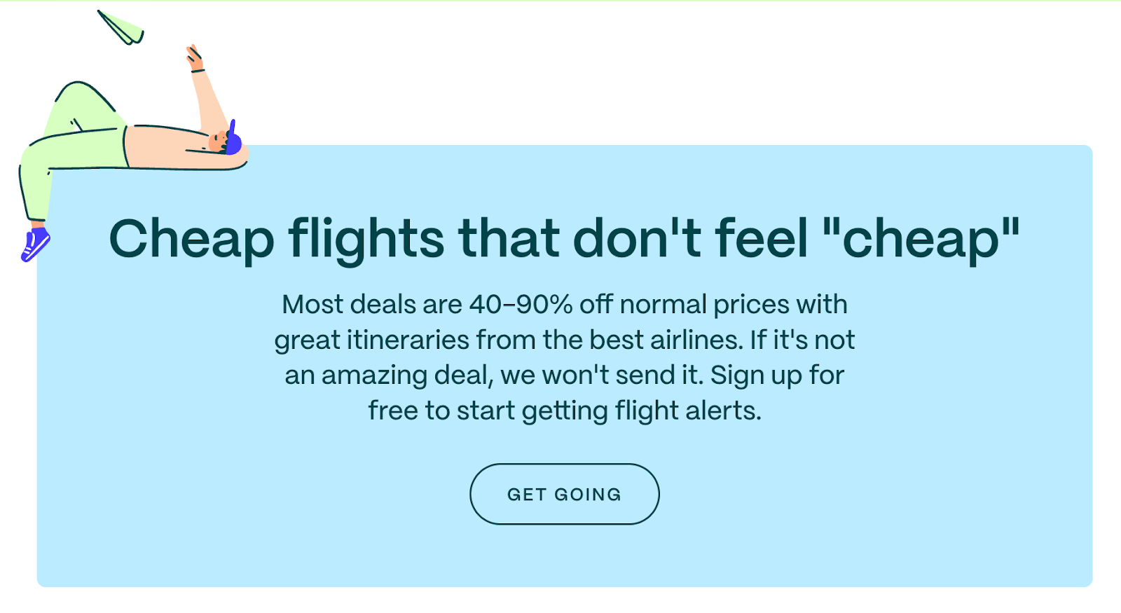 For example, check out this Going page. This brand states that its service allows users to find flight deals "40-90% off normal prices." Note how the value proposition doesn't advertise the best possible outcome of signing up. Instead, it provides a range of savings new customers can achieve, properly setting prospects' expectations and convincing them to try Going's solution.