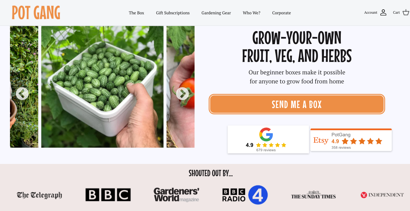 On the other hand, Pot Gang takes a slightly more traditional approach. The brand shows off Google and Etsy ratings, knowing that these two instances of social proof say more than enough about the reliability of its products and services.